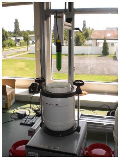 In order to obtain precise measurements during sensor calibration, it is important to take several precautions [44]. First, the sensors need to be completely immersed in the standard liquid, which requires a sufficiently dimensioned container. Here, we used 6.4 dm3 bottles (diameter of 19.5 cm, height of 23.0 cm, high density polyethylene) to ensure that the area of influence of the SMT100 sensor is completely captured. Second, the sensor needs to be fixed and centrally immersed into the bottle to reduce effects of positioning on the measurements. Finally, possible degrading effects of standard liquids on the sensor plastic body need to be minimized by carefully cleaning the sensor after each measurement and minimizing the contact time. In order to guarantee that these precautions were met in the best possible way and to allow calibration of a large number of sensors in a limited amount of time, a dedicated calibration station was developed and manufactured at Forschungszentrum Jülich GmbH (Figure 2). The calibration station consists of five containers arranged in parallel on a work bench. The density of the glass beads packing (M2) affects the reference permittivity value of this calibration medium. The reference permittivity value used in this study corresponds to the maximum density of the glass beads packing according to [43]. However, insertion and removal of the SMT100 sensor during the calibration process may affect the density of the glass beads packing. In order to ensure that the density of the packing remains optimal during calibration, a vibration machine is used to compact the glass beads packing to the maximum density before each calibration measurement (see Figure 3). In order determine the time needed for achieving the maximum density of the glass beads packing after sensor insertion, we conducted a compaction experiment with the vibration machine (see Section 3.2). For each experiment, a standard SMT100 sensor was fully inserted into the glass beads and the sensor response was recorded every 15 s for a time period of 300 s.