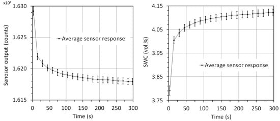 Figure 5 shows the decrease in sensor response due to the increasing density of the glass beads packing during the compaction experiment. Clearly, the strongest changes in sensor response occurred in the first 15 s. Subsequently, the change in sensor response continuously decreased until the end of the experiment (after 300 s). The total difference in terms of raw counts was 113, which corresponds to an increase of equivalent SWC of 0.33 vol.% (Figure 5). Based on these results, it was decided to perform the calibration measurement after 120 s as a compromise between calibration efficiency and accuracy. The change in sensor response due to further compaction from 120 to 180 s was negligible with approx. 0.05 vol.%.