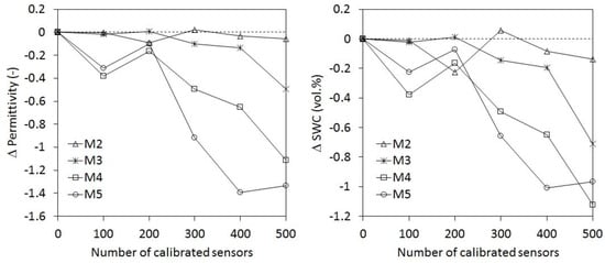 Alteration of reference liquids (M3–M5) during the calibration of 500 SMT100 sensors (left and right panel present permittivity and equivalent SWC calculated with the Topp equation [36], respectively). The values represent the deviations from the permittivity of the fresh reference media. The deviations were derived from the average response of two SMT100 sensors that were repeatedly used to measure the permittivity during the calibration of 500 SMT100 sensors (i.e., always after 100 calibrations). The results for M2 (glass beads) are also presented for comparison.