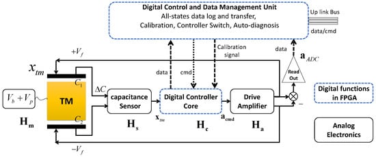 A typical HPESA consists of a Test Mass (TM) and three surrounding pairs of electrodes to form the differential capacitances for both the position sensors [,,] and the electrostatic actuators that balance the input acceleration. The simplified block-diagram of an HPESA is shown in Figure 1. The actuation voltage commands are generated by a feedback controller, which is driven by the TM position measurements. As the core of instrument electronics, the controller is in charge of stabilizing the TM within a small range about the sensor cage center, also known as the equilibrium point, where the accelerometer attains the performance decided by the hardware noise floor. When the TM stays within this range, the nonlinearities of both the position sensor and actuation force are maintained at a negligible level, so that the feedback read out can accurately and linearly measure the accelerations applied to the accelerometer frame [].