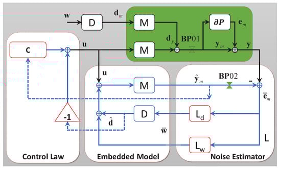 The embedded model, which consists of , and of the noise estimator , constitutes the state predictor of the plant and disturbance. It is called the “state predictor”, since it forecasts the state at the next time step using the current state and input values of each DT integrator (Σ block). The loop from the output port back to the input port, passing through and is the Predictor Loop (PL). The main input and output of the PL are the sensor measurement , the predicted output and the prediction error . The performance of the state predictor is mainly described by , whose relation to the model error and to the equivalent disturbance according to the EMC theory [] is: