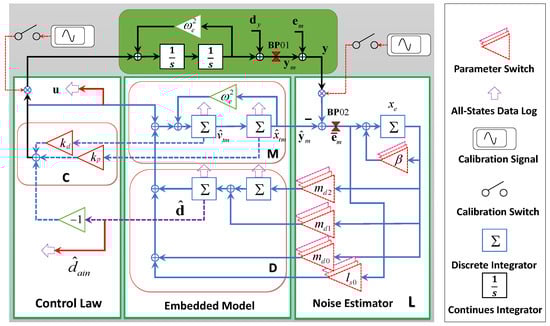 In Figure 3, the controller working mode could be switched by changing five gain parameters in the noise estimator. All of the estimated states are registered in the discrete integrator during switching, which will guarantee a smooth feedback control. Data to be logged are marked by purple arrows, including all of the observed states and output commands. Calibration signals and injection points are also marked in the figure.