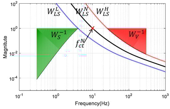 where is the target cross-over frequency. The calculation process of this final target loop shape is illustrated in Figure 4, in which the complementary sensitivity boundary is obtained by the function in the high-frequency range, and the sensitivity boundary is obtained by the reciprocal function in the low-frequency range. These two boundaries decide the green and red areas of Figure 4, which means that the resulting and should be constrained to stay outside of these forbidden areas according to Equation (18). The trade-off between disturbance rejection and robustness can be precisely adjusted by tuning in Equation (20). The tolerance factor is empirically set to 2.5 here in order to leave enough space to the optimization routine for searching a compromise between low- and high-frequency performance, as well as for preventing transfer function overshoot.