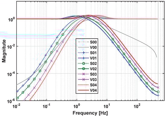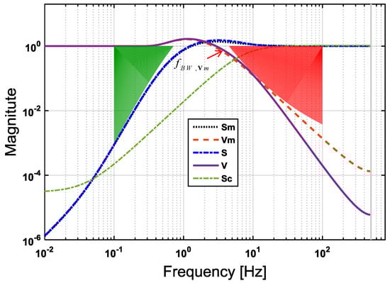 The transfer function from to is the predictor complementary sensitivity. From Figure 3, is the transfer function from to , revealing the confidence of the predictor (output ) to the measurement (input ). The wider the bandwidth of , the more information/noise of will be repeated in . Similarly, the transfer function from to is the sensitivity , which is a high-pass filter rejecting the outside disturbance in the stopband. Both transfer functions can be derived from Equations (6)–(9) in the form of the state space []. For simplicity purposes, and are given as follows: