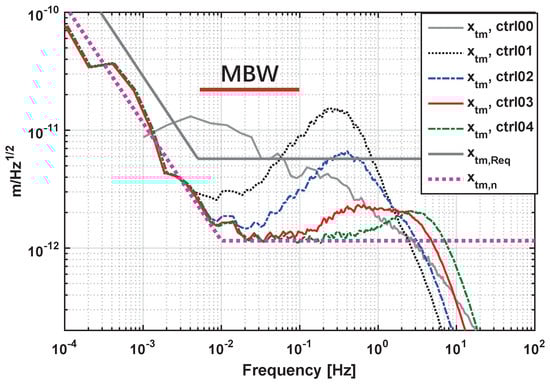PSD of the residual TM relative position from the closed-loop simulations under four EMC designed controllers with = 1.5, 2, 3 and 4 Hz: “ctrl01”–“ctrl04”; and a PID controller with a 3-Hz cross-over frequency: “ctrl00”. The measurement band (MBW) is also marked in the figure.