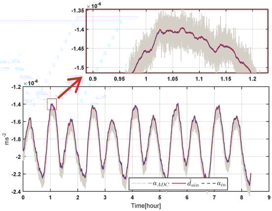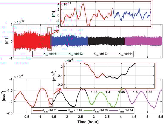 In an HPESA design, the acceleration signals to be measured are usually below 0.1 Hz. Therefore, for the sensor noise rejection consideration, the measurement bandwidth is preferred to be as low as possible; while on the disturbance rejection aspect, the control bandwidth should be as high as possible. In PID controllers, feedback command readout is the only measurement output; therefore, its measurement bandwidth is the same as the control bandwidth ; while in this work, in the EMC framework, controllers could directly use the estimation of acceleration from the disturbance predictor model instead of the actual measurement; this is shown as in Figure 3. In this way, the measurement bandwidth can be separated from the whole control loop bandwidth . Figure 9 shows an example of the simulated acceleration outputs’ comparison at different ports of the EMC controller in the time domain, where and are accelerations from the feedback command (shown in Figure 1) and from the disturbance predictor estimation, respectively. From the figure, it could be seen that the estimation of could precisely repeat the actual measurement of the acceleration input , meanwhile preventing the disturbance of the high-frequency sensor noises, which contrarily have been introduced by the large control bandwidth at the output port of the feedback command that are plotted in the grey dashed-dotted line of Figure 9 for comparison. It should be pointed out that the noises in mainly come from the detection noises of capacitive position sensing, and the controller itself does not produce additional noises. These results show a good solution of the contradiction between enough measurement noise rejection and high control bandwidth by the EMC algorithms. This is one of the most significant advantages of EMC and is applicable to the inertial sensor-type accelerometers for the TianQin mission or other space missions that have even much lower measurement bands.