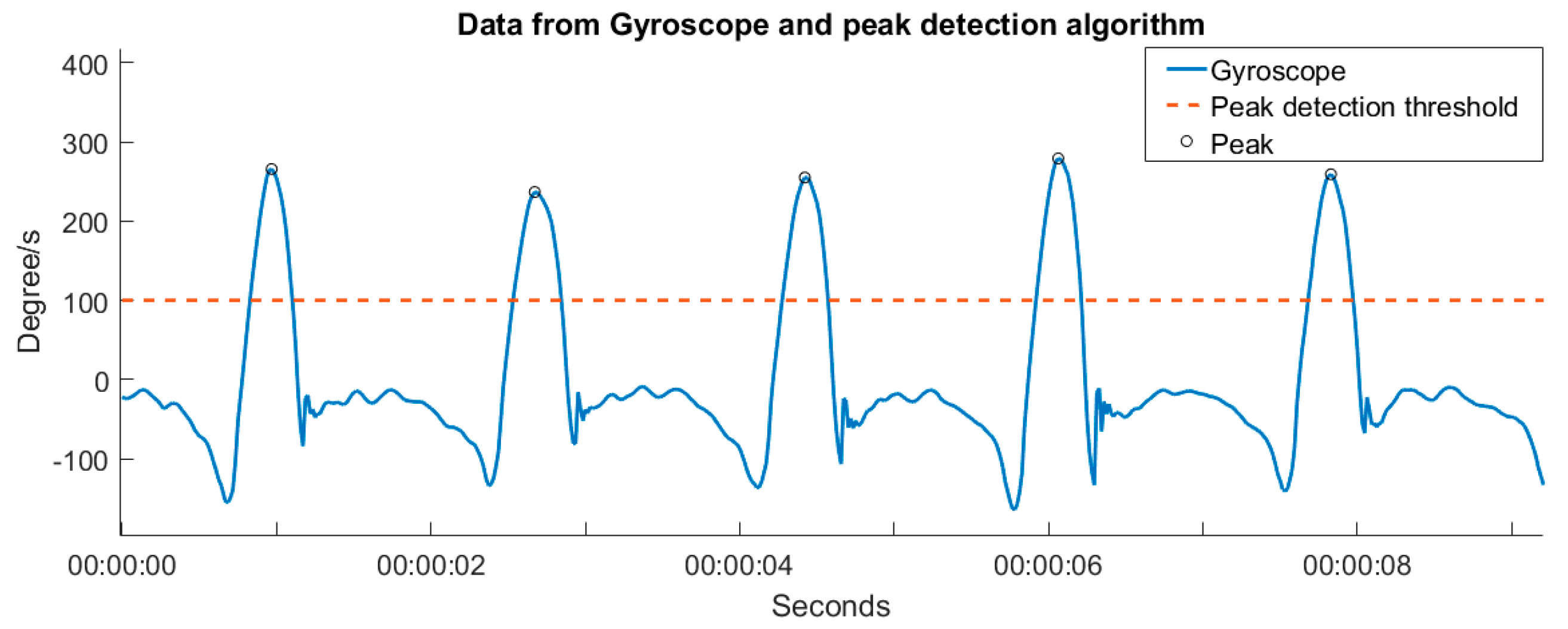 Data from the Shimmer 3 is processed through a simple threshold algorithm. Swing phases in the gait patterns were detected by setting a 100 degree/s threshold. The number of steps was then calculated as the number of swing phases on a single leg multiplied by two. A sample of the gyroscope data and the peaks detected by the algorithm is shown in Figure 2.