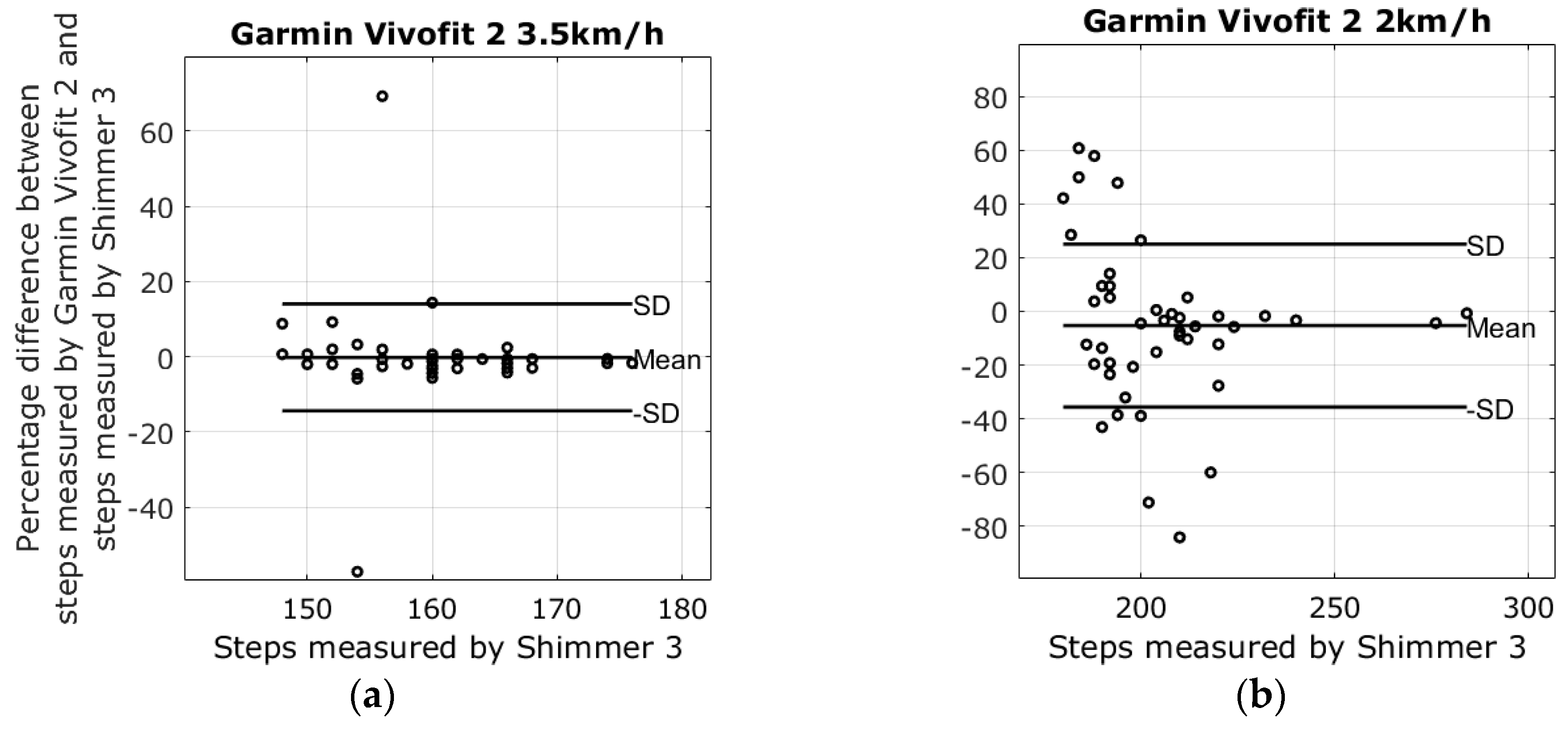 Results from the walking tests with plots showing the difference between the steps measured by the Garmin Vivofit 2 and the Shimmer 3. (a) The percentage error of the 3.5 km/h walking test is −0.2 ± 14.2; (b) The percentage error of the 2 km/h walking test −5.3 ± 30.4.