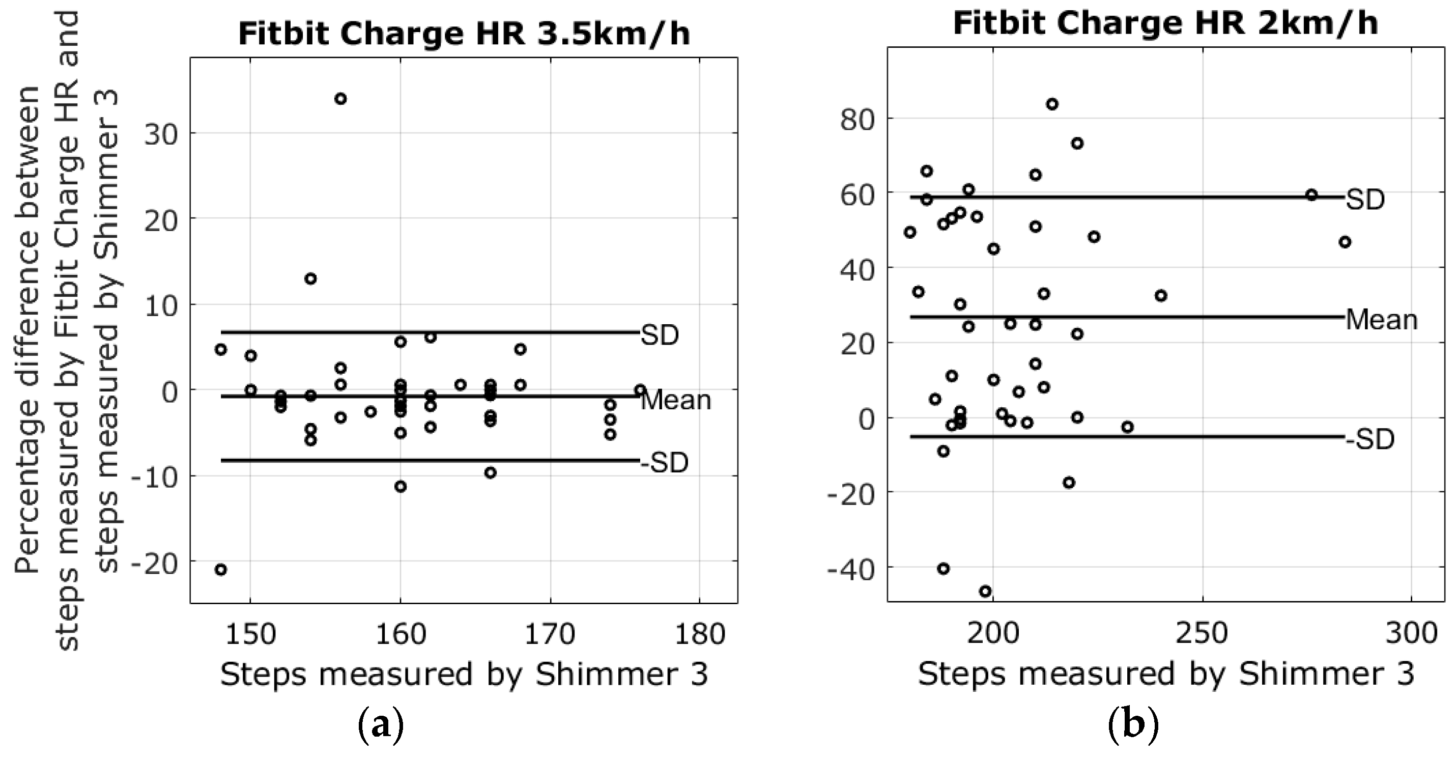 Results from the walking tests with plots showing the difference between the steps measured by the Fitbit Charge HR and the Shimmer 3. (a) The percentage error of the 3.5 km/h walking test is −0.7 ± 7.5; (b) The percentage error of the 2 km/h walking test 26.8 ± 32.0.