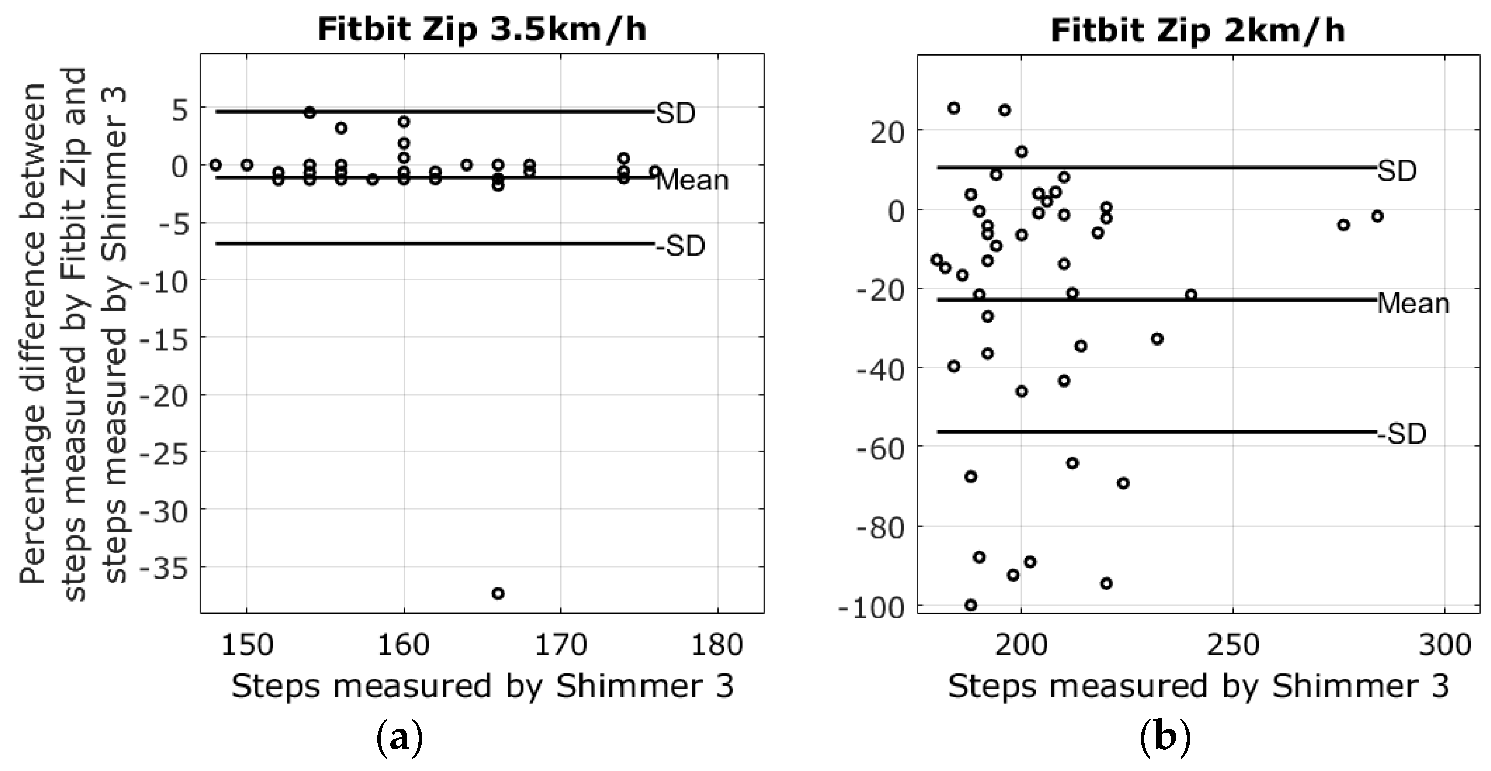 Results from the walking tests with plots showing the difference between the steps measured by the Fitbit Zip and the Shimmer 3. (a) The percentage error of the 3.5 km/h walking test is −1.1 ± 5.8; (b) The percentage error of the 2 km/h walking test −22.9 ± 33.3.