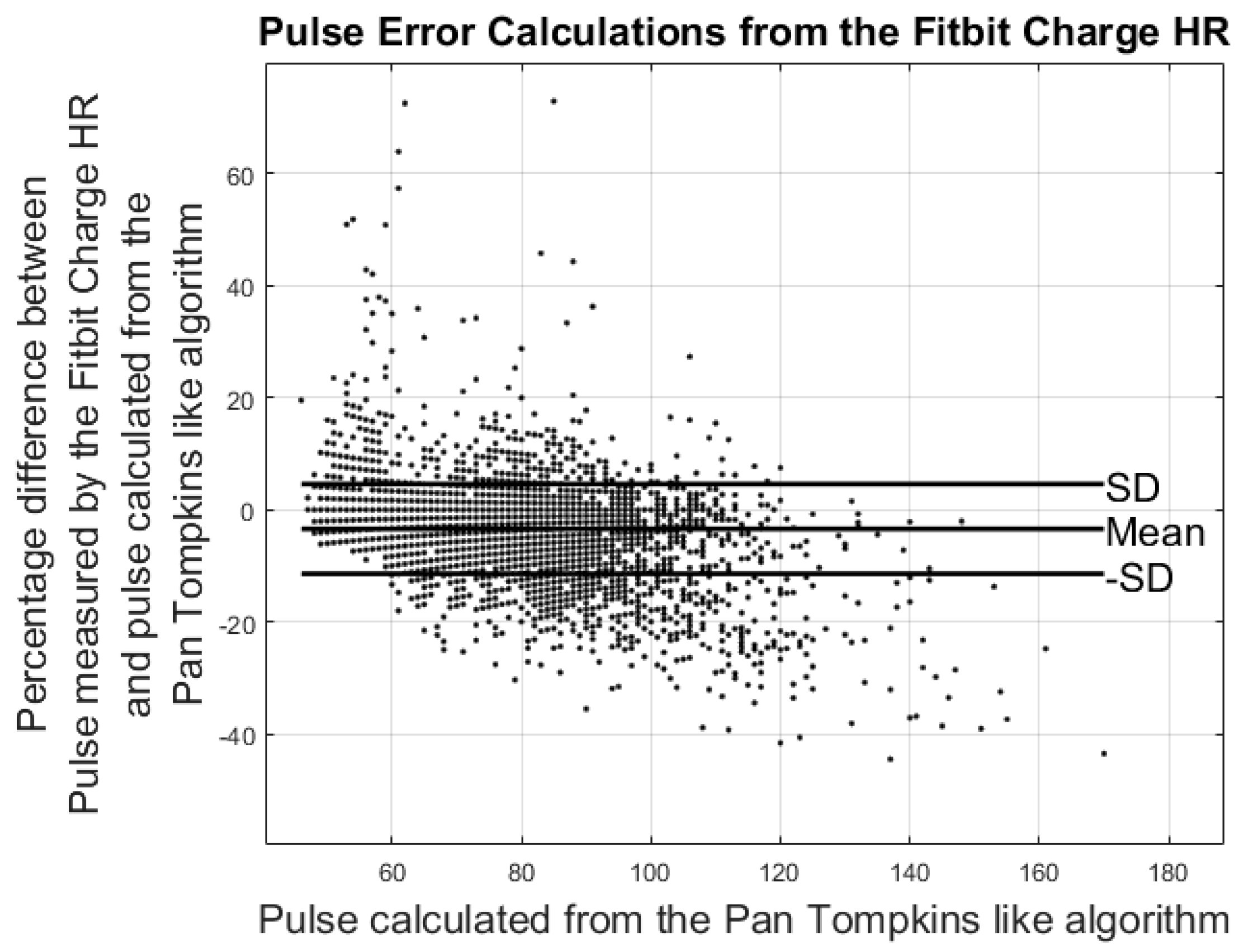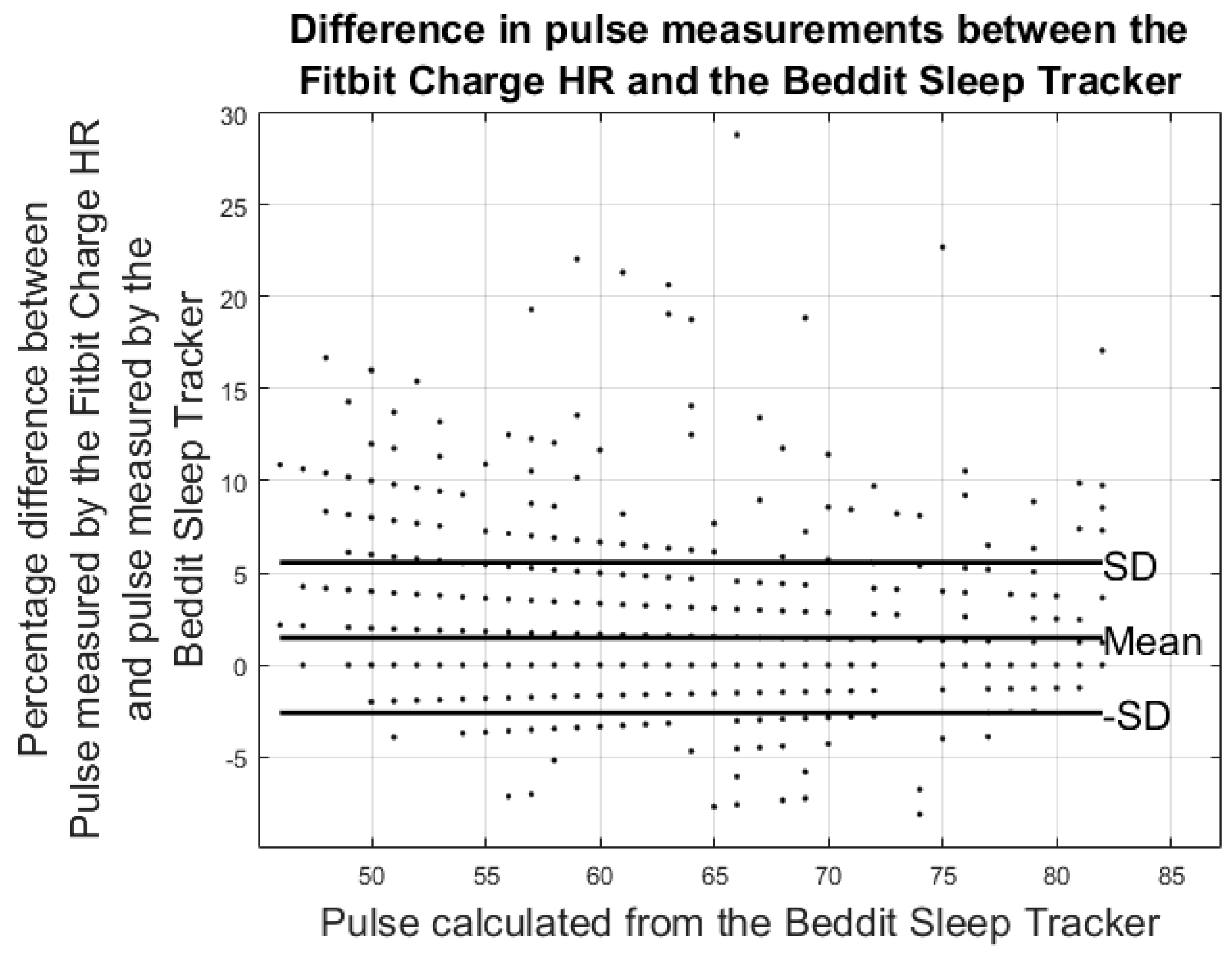 Results from the pulse error calculations are shown in the modified Bland-Altman plots in Figure 7 and Figure 8. The ordinate axis shows the percentage error as compared to the results from the Pan Tompkins algorithm and the horizontal axis shows the pulse calculated from the Pan Tompkins algorithm. Equations (2) and (3) were used to calculate the percentage error for each device. Figure 8 shows the comparison of the pulse measurements between the Fitbit Charge HR and the Beddit sleep tracker.