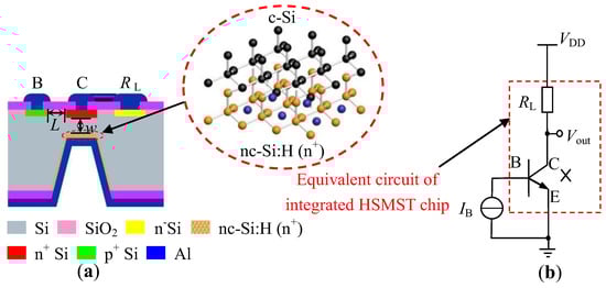 Figure 1a shows the basic structure model of an integrated heterojunction silicon magnetically sensitive transistor (HSMST) chip. The proposed integrated chip is constructed by a nc-Si:H/c-Si heterojunction magnetic sensitivity transistor and an integrated load resistor (). The HSMST contains an emitter (E), a base (B), and a collector (C). L is the length of the base region for HSMST, and w is the width of the base region. The inset shows the atom distribution at the interface of nc-Si:H thin films and silicon substrate, where a heterojunction structure is formed. Figure 1b shows the equivalent circuit of the HSMST testing circuit, where is the supply voltage, is the base current, is the collector load resistor, and is the output voltage of the chip. As shown in Figure 1b, the part in the dashed box is the equivalent circuit for integrated HSMST chips.