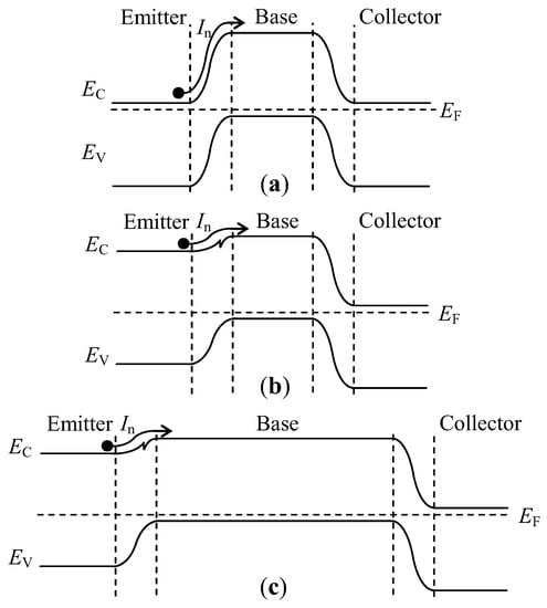 Figure 2a–c show the band diagrams of a homojunction transistor, a heterojunction transistor, and an HSMST, respectively. As shown in Figure 2b, the bandgap width for the heterojunction emitter junction is obviously improved compared with the band diagram of the homojunction transistor in Figure 2a. The carrier injection efficiency (γ) from the emitter junction is a significant figure of merit for a transistor, and it is defined as in Equation (1) [].