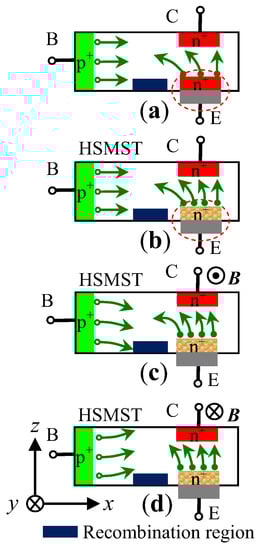 Figure 3 illustrates the working principle of a magnetically sensitive transistor (MST) under different external magnetic fields (B) along the direction of the y-axis. The movement of carriers for the homojunction magnetically sensitive transistor without an external magnetic field is shown in Figure 3a. Figure 3b shows the activity for HSMST in the absence of an external magnetic field. As shown in Figure 3c, when an external magnetic field (B > 0 T) is applied along the direction of the negative y-axis, the collector current is decreased. As one can observe in Figure 3d, under the magnetic field (B < 0 T) along the opposite y-axis direction, the variation of the collector current is reversed with respect to Figure 3c.