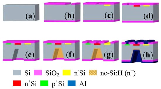 Figure 4 shows the main processing steps of the integrated HSMST chips. (a) Cleaning a p-type <100> orientation silicon wafer with high resistivity; (b) growing a SiO2 layer with a thickness of 600 nm by thermal oxidation, and then first photolithography to etch a SiO2 layer as the window of the collector load resistor; (c) n+ type doping to form the collector load resistor and then depositing the SiO2 layer after clearing the wafer, a second photolithography to fabricate the window of collector; (d) n+ type heavily doping to make the collector and depositing the SiO2 layer after clearing the wafer, through a third photolithography to fabricate the window of the base region; (e) p+ type heavily doping to fabricate the base region, depositing the SiO2 layer after clearing the wafer, via a fourth photolithography to etch the lower surface as the window of the emitter and make a C shape silicon cup (C shape silicon cup is an etch pit) by ICP (inductively coupled plasma); (f) n+ type heavily doping to the lower surface of the C shape silicon cup to fabricate the emitter, and high-temperature annealing to wafer at 1000 °C for a half-hour; (g) the fifth photolithography to etch the upper surface as a pin hole; (h) metal Al made by vacuum evaporation and a sixth photolithography to form the electrodes, growing metal Al on the lower surface by vacuum evaporation, metallizing at 420 °C for twenty minutes to form an ohmic contact. The chips are fabricated on the p-type <100> double-sided polished silicon wafer with high resistivity by micro electro-mechanical systems (MEMS) technology and chemical vapor deposition (CVD) method.
