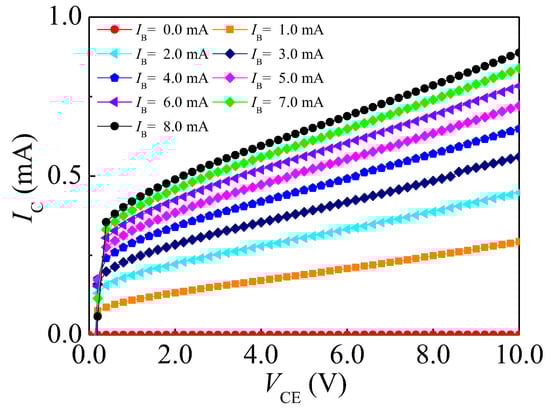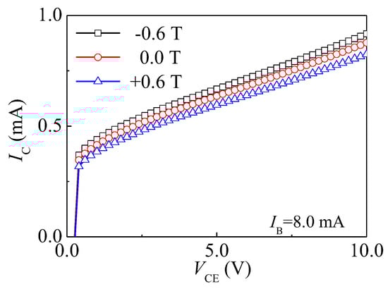 The current–voltage (–) characteristics of the proposed transistors were measured by a semiconductor characteristic test system (KEITHLEY 4200, Keithley, Cleveland, OH, USA). The – characteristics of the HSMST are shown in Figure 6. When B = 0 T, the base current () changes from 0 to 8.0 mA with steps of 1.0 mA, and changes from 0 to 10.0 V with steps of 0.2 V. At a constant , the increases with . The – curves become flat for the homojunction transistor, while reaches a certain value. In this paper, the – curves do not become flat, the proposed transistor has unsaturation characteristics. When is fixed, the is less than the , so the current amplification coefficient (β) of the HSMST is less than 1. In this instance, the β is unequal at different .