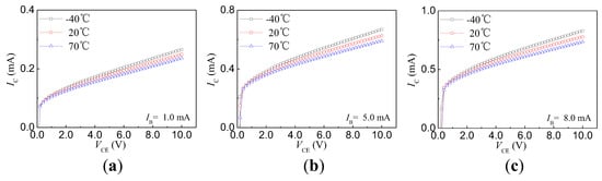 The – characteristics at different temperatures were measured by a high- and low-temperature humid chamber (GDJS-100 LG-G, OBIS, Suzhou, China). Figure 7 indicates the – characteristics of HSMST at different temperatures, including −40°C, 20°C, and 70°C. The temperature characteristics of HSMST when = 1.0 mA, 5.0 mA, and 8.0 mA are shown in Figure 7a–c, respectively. The experimental results show that has a negative temperature coefficient, as shown in Figure 7. The carriers injected from the emitter junction are divided into two cases. The carriers passing through base region are collected by the collector region, and the carriers are recombined in the base region. The number of carrier recombinations increases with temperature. Under constant and , the decreases with the temperature.
