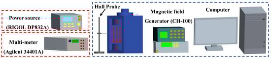 As shown in Figure 9, the testing system of the magnetic field sensor includes a magnetic field generator (CH-100, Beijing Cuihaijiacheng Magnetic Technology (Beijing, China), a multi-meter (Agilent 34401A, Agilent, Santa Clara, CA, USA), a power source (RIGOL DP832A, RIGOL, Beijng, China), and a computer.
