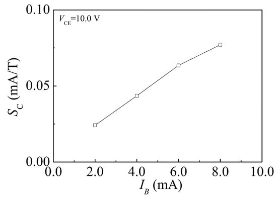 According to the equivalent circuit in Figure 1b, the collector current is transformed to a collector output voltage by an integrated load resistor, so collector output voltage () changes with B. The magnetic sensitivity () of the collector output voltage can be expressed as []: