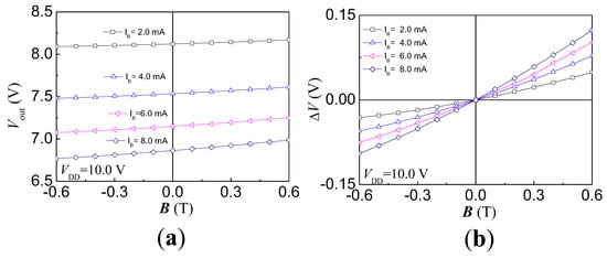 Figure 10 shows – characteristics of the HSMST with = 8.0 mA at different B. On the condition of constant and , the has a minor value at B = +0.6 T and a major value at B = −0.6 T. Based on Equation (2), the relationship curve between and is plotted as shown in Figure 11 through numerical calculations, when = 10.0 V and the is from 2.0 to 8.0 mA with steps of 2.0 mA. When = 8.0 mA, the is 0.077 mA/T. On the condition of constant , increases with , and the is enhanced with . At = 10.0 V, the increases with .