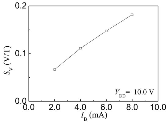 The HSMST chip integrated a collector load resistor () of 4.1 kΩ. As shown in Figure 1b, the is converted to by . Figure 12a shows the relationship curves between and B with = 10.0 V at different . When both and are constant, increases with B. The decreases with under constant and B. According to the relationship of , and , the relationship curves between and B are plotted as shown in Figure 12b by numerical calculations when is 10.0 V and is from 2.0 to 8.0 mA, with steps of 2.0 mA. The increases with B at constant and . Under constant and B, increases with . is calculated based on Equation (3), and the relationship curve between and is shown in Figure 13. At room temperature, = 8.0 mA and = 10.0 V, the is 181 mV/T. Under constant and B, increases with , and the increases with . When = 10.0 V, the increases with the .