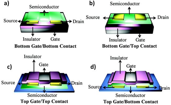 Four types of OFET device structure: (a) bottom gate/bottom contact; (b) bottom gate/top contact; (c) top gate/top contact; and (d) top gate/bottom contact. Reprinted with permission from Ref. [40]. Copyright (2012) American Chemical Society.