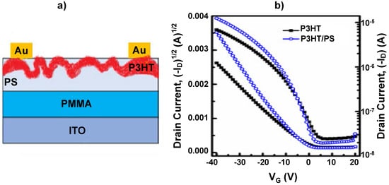 (a) Schematic structure of OFET sensor with poly(3-hexylthiophene)/polystyrene (P3HT/PS) blended film; and (b) transfer curve of P3HT/PS film with the best mixing ratio of 1:4 in weight. Reprinted with permission from Ref. [22]. Copyright (2016) Elsevier.
