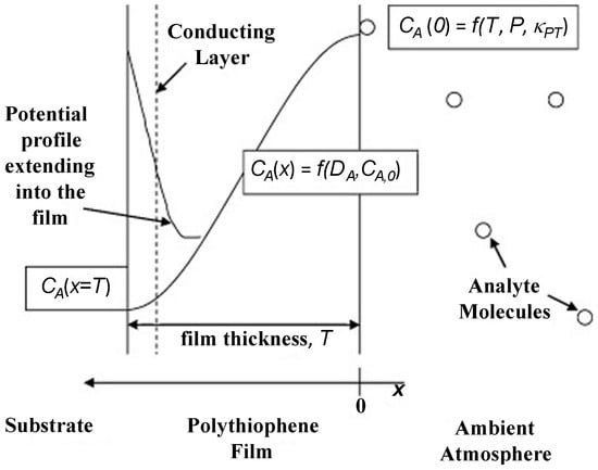 There are only a few reports illustrating the interaction between amines and semiconducting polymers. In one study, it is proven that the sensitivity correlates with the molecular volume of amines, which means that larger amines having poor diffusion into the polymer/dielectric interface [27]. They present a framework to describe the analyte concentration from film surface to semiconducting polymer/dielectric interface (Figure 3). In this framework, all factors affecting the analyte concentration are considered. Analyte concentration at the film surface (CA(0)) is a function of the partition coefficient (κPT) of the sensor film, ambient temperature (K) and analyte pressure (P). Then analytes diffuse into the film until they reach the conducting channel at the semiconducting polymer/dielectric interface. It is the concentration of analyte at this interface, CA(x = T), that gives rise to the electrical response of the sensor. This concentration is dependent on the film thickness (T) and the diffusion coefficient (DA) of the analyte. The diffusion coefficient DA encapsulates the effect of film structure, which is a function of analyte size relative to crystalline plane spacing in the film. In another report, X-ray reflectivity (XRR) monitored the poly-3-butylthiophene film swelling under butylamine exposure [46]. This indicates that the film can adsorb analytes and leads to thickness increase [14]. Though the thickness increase is lower than the electrical response, the physical swelling should be included in the sensing mechanisms just like trapping, dedoping and so on.