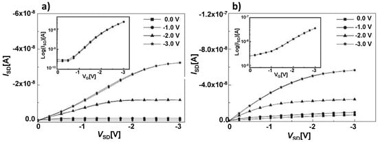 Output curves of PTA-OMe OFETs: (a) before NO2 exposure; and (b) after NO2 exposure. The insets show saturated transfer curves of the corresponding OFETs in semilog plots. Reprinted with permission from Ref. [28]. Copyright (2007) Wiley-VCH.