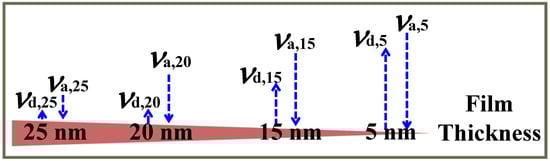 The supposed sensing process of H2S in film of polymer PSFDTBT. Both adsorption and desorption speeds of H2S molecules increase when the polymer films become thinner. However, desorption speed (νd,n; n = 25, 20, 15, and 5 nm) increases much faster than adsorption speed (νa,n). The length of arrows denotes the level of the speed.