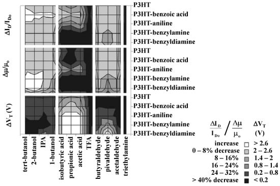 Due to the advantage of multi-parameter extracted from transfer characteristics, transistor sensors can diagnose more than one analyte at the same time. Multi-parameter data provide a rich source of sensing information and can reveal the non-obvious features of weak interaction between gas analytes and polymer semiconductors. A PTA-OMe sensor has recorded the change of four parameters VT, μ, ION, IOFF at VGS = VDS = ±2.5 V when the transistors are under exposure of different alcohols [34]. The PTA-OMe had a quite low hole mobility around 5 × 10−5 cm2·V−1·s−1 and a weak response toward alcohols. However, with the four measured parameters, sensing performance of four tested alcohols (methanol, ethanol, 1-propanol and isopropanol) could be discriminated. Sensor arrays with integrated OFET sensors show much better performance. For example, an array comprising four sensors with permutations of 70 nm and 140 nm film thicknesses and polybutylthiophene and polyoctylthiophene were fabricated [27]. This array could differentiate the mixtures of triethylamine and hexylamine by measuring the variation of VT, ISD, and μ. Another integrated sensor array, composed of five polymers with complementary sensing response by incorporating functional groups into the molecules, was fabricated by inkjet printing method [39]. Twelve gas analytes were exposed to this sensor array and the response was summarized in Figure 6, in which three parameters (ΔISD, Δμ, and ΔVT) were recorded. The differential response of multi-parameter makes these OFETs attractive for use in electronic nose.