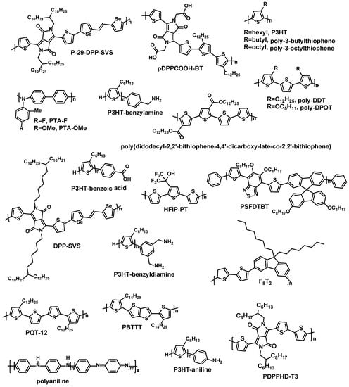 Reported molecular structures of semiconducting polymer used in the OFET sensors.