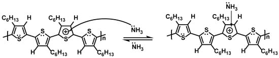 A good understanding of the sensing mechanism is not only important, but may also enable guidelines for modifying and improving sensor performance. Generally, the interaction between gas analyte and sensing layer changes the charge distribution at the semiconductor/dielectric interface. The interaction is always different between various gas analytes and sensing layers and there has been no instruction to predict the analyte–polymer interaction until now. For the tested semiconducting polymers, such as P3HT and its derivatives, PQT-12, pDPPCOOH-BT and so on, ammonia always reduces the current flowing in the conducting channel. The current reduction (ΔISD) is generally attributed to lone pair of electrons of ammonia which influences the charge transport in two aspects: (1) form linkage type structure with organic molecule as shown in Scheme 2 when NH3 diffuses in the thin film, which causes current decrease in the conducting channel [13]; and (2) trap/dedope at the polymer semiconductor/dielectric interface which negatively shifts the threshold voltage (ΔVT). NH3 dedopes the P3HT film to compensate the ambient oxidant in P3HT film, which has been confirmed in the purification process of synthesized P3HT [13]. Trapping effect of NH3 is verified through gas exposure toward P3HT/PS mixture in the film. The mixed film has much P3HT/PS interface and blocks NH3 diffusion into the P3HT/dielectric (PMMA) interface, which results in nearly no VT shift [22].