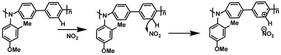 Many studies report on NO2 gas sensors. The achieved sensitivity is impressive with the lowest detection limit down to 10 ppb [28]. Contrary to ammonia sensor, the NO2 gas sensor usually increases the flowing current in the device channel [16,28]. Figure 4 displays the output and transfer characteristics of PTA-OMe OFETs without gas exposure (Figure 4a) and with gas exposure of 10 ppm NO2 at VSD = VGS = −3 V (Figure 4b). There is a clearly nonlinearity of the output characteristic at low source-drain voltage (VSD) in the pristine device. After exposure to 10 ppm NO2, the output characteristics turned linear at low VSD and unsaturated at high VSD, indicating the existence of doping at the contact as well as in the channel. The transfer curve shows the threshold voltage shifted toward positive direction under NO2 exposure. The supposed interaction between NO2 and PTA-OMe is shown in Scheme 3 [16,47]. In this experiment, semiconducting PTA-OMe was amorphous and had low carrier mobility of around 10−5 cm2·V−1·s−1 due to absence of crystalline grain boundary. It is not μ but VT is more sensitive to NO2 gas, which tells the advantage of multi-parameter OFET sensor.