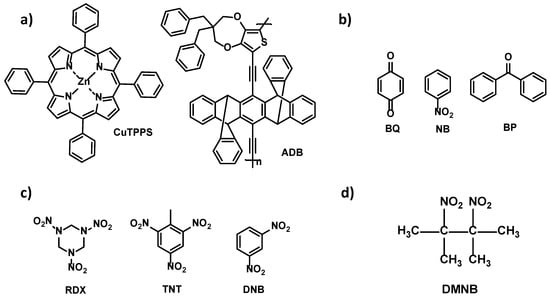 Chemical structures of: (a) compounds CuTPPS (CuII tetraphenylporphyrin) and ADB (copolymer of diethynyl-pentiptycene and dibenzyl-ProDOT); (b) non-explosive and (c) explosive nitro-based gas analytes; and (d) 2,3-dimethyl-2,3-dinitrobutane (DMNB).