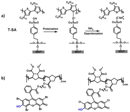 Siloxane layer (T-SC/SA) bound with sulfonic acid group was modified onto the SiO2/Si surface (Scheme 5a) [19]. In a BGTC structured device, the sulfonic acid group protonated the semiconducting P3HT and resulted in high positive VT of up to 45 V. Under exposure to alkaline amines, the positive VT showed negatively shift of about 60 V due to the deprotonation effect of the alkaline amines. In contrast, a negative shift of VT was only 10 V for the bare SiO2/Si dielectric and was around 30 V for n-hexadecyltrichlorosilane (HDTS)/SiO2/Si dielectric. The huge electric response of T-SC/SA to alkaline amines holds high promise for its applications in chemical sensors. Ring-opening metathesis polymerized (ROMP, Scheme 5b) dielectric materials exhibited similar effect as T-SC/SA dielectric and TGBC structure was used in this study [15]. When exposed to ammonia, the –OH group of ROMP dielectric could be deprotonated and thus formed mobile ammonium ions (NH4+). Under applied voltage, the mobile NH4+ ions could move within the dielectric materials toward drain electrode and localized near the dielectric/P3HT interface or even in the P3HT layer. Hence, the density of mobile charge carriers in the channel was increased by the protonated NH3 by the ROMP dielectric layer.