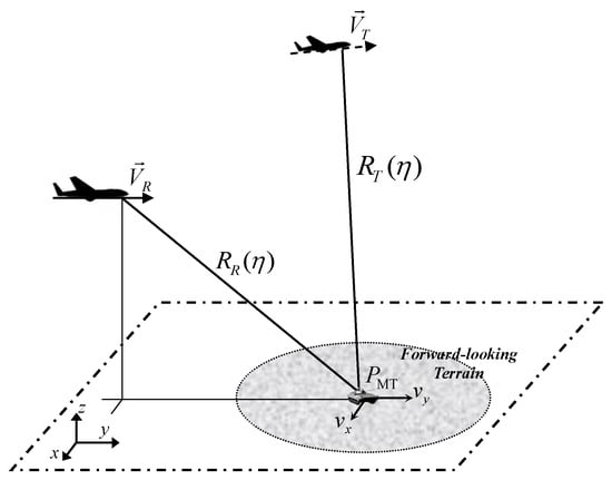 Currently, as an emerging SAR technology, bistatic SAR (BiSAR) has received considerable attention [3,4,5,6]. In BiSAR, the transmitter and receiver are placed on different platforms; therefore, the two resolution directions are determined both by the transmitter and receiver. When one platform works in the forward-looking mode, the other can insure the difference between the two resolution directions, thus generating a 2-D image [1,7]. This kind of BiSAR is called bistatic forward-looking SAR (BFSAR) [8,9,10]. The advantages of BFSAR have been analyzed in [1,11,12], and the forward-looking imaging ability of airborne BFSAR has been first tested by us in 2013 [10].