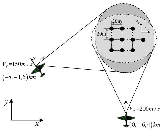 To verify the validity of the proposed BFSAR moving-target imaging method, numerical simulations are carried out in this section. The relevant simulation parameters are shown in Table 1. To highlight the moving-target imaging capability of the proposed technology, the target is assumed to comprise ten point-scatterers, and it is shown in Figure 3. The distances between each two adjacent point-scatterers along the x-axis and the y-axis are both 20 m. The cross-track velocity of the moving target (i.e., ) is assumed to be 12 m/s and the along-track velocity (i.e., ) 10 m/s.