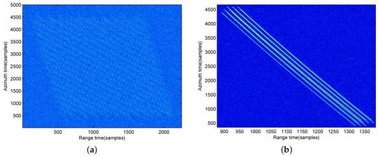 Raw date of the moving target for BFSAR. (a) In the 2-D time domain; (b) In the range-compressed domain.