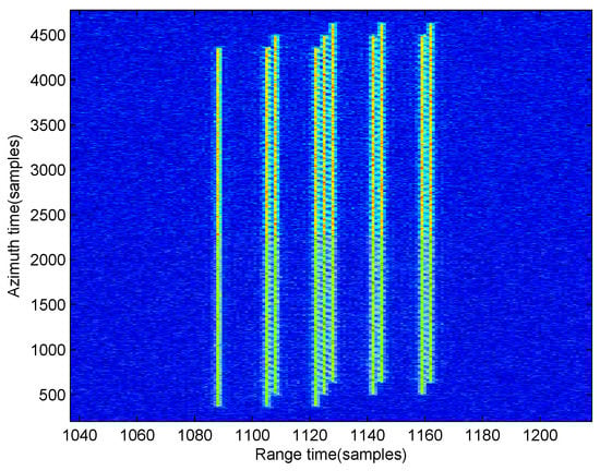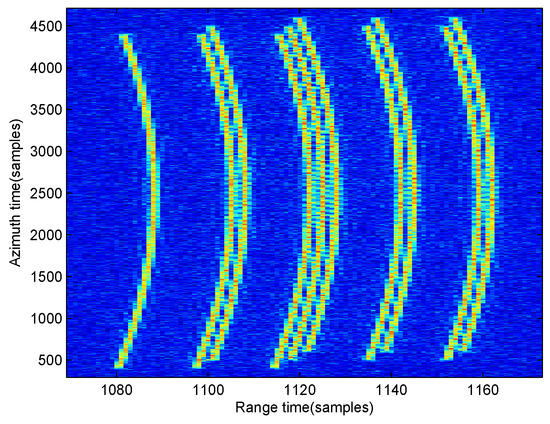 Using the optimal solution is [12.0167 m/s, 9.9861 m/s], the range curvature of the moving target can be corrected completely using Equation (26), and the processed result is shown in Figure 7. From this figure, we can establish that most moving target energy has been gathered in one range bin.