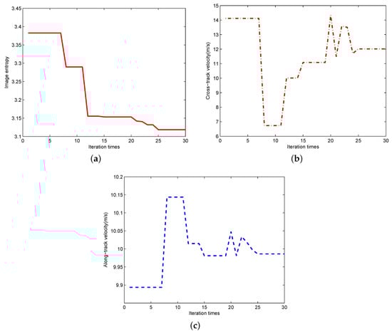 The solving process of the new optimization problem for the moving-target imaging. (a) Image entropy; (b) Estimated cross-track velocity; (c) Estimated along-track velocity.