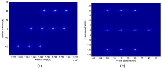 Finally, the moving target can be well refocused and the imaging result is shown in Figure 8, where Figure 8a is before the geometric rectification and its range direction is in the bistatic range domain, while Figure 8b is after geometric rectification and it is in the same domain with the original scene in Figure 3.