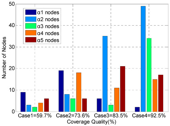 In Figure 1, Case 1 has a harsh time constraint, so more optical density sensors which can be deployed relatively fast have been used. Case 2 has a strict distance constraint, so the optical density sensors and smoke density sensors which have larger perceived radius have been more used. Case 3 has a limited cost constraint, so the number of the lower cost temperature sensors is 35. This number is relatively large. At the same time, taking into account the need to meet the requirement of high confidence, the number of infrared sensors is also 34. Case 4 has a strict minimum confidence requirement, so the video sensors which have higher confidence have been used in a large number of applications, compared to the former three conditions. However, under the cost and deployment time constraint, the number of video sensors is limited to 34. The number of temperature sensors (49) is the largest. The simulation results show that the ASMP algorithm can allocate sensor resources effectively under multiple constraint conditions, and make the performance of barrier coverage meet the requirements of the application.