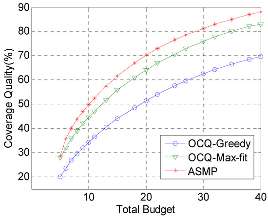 Figure 2 shows the coverage quality when the total budget is set to different values for the OCQ-Greedy, OCQ-Max-fit and ASMP algorithm, respectively. With the increase of the budget, the quality of coverage increases. On the other hand, the coverage quality optimized by our technique is much better than that achieved by OCQ-Greedy and OCQ-Max-fit, when the total budget which is restrained by budgetary constraints is relatively more. This is due to the fact that when the total budget is relatively large, the number of sensor nodes and computational complexity increase significantly. The OCQ-Greedy algorithm based on a greedy algorithm only chooses the current optimal solution, which is probably the local optimal solution. OCQ-Max-fit enumerates the skyline points of deployment schemes to compute the coverage quality. Enumeration methods are very simple and only suitable for a relatively small network scale. However, ASMP uses the aggregate function to approximate the maximal function, and only a small part of the functions are involved in the computation. Therefore, the gradient computation is reduced significantly, which reduces the computational cost and is more suitable for large-scale networks.