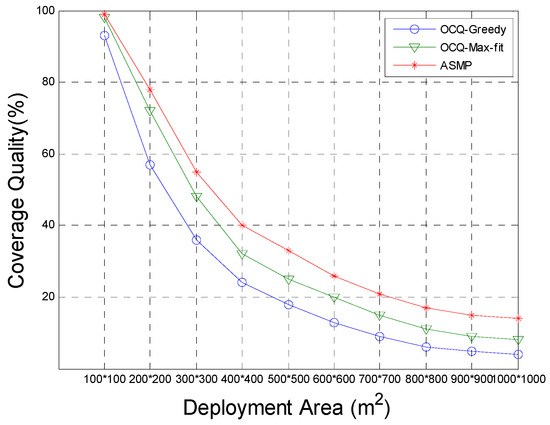 Comparison of the coverage quality for our method (ASMP) with respect to the OCQ-Greedy and OCQ-Max-fit coverage algorithm, when the deployment area A is set to various values, and the coverage quality, which changes with the deployment area A, is set to various values. This figure shows that the coverage quality optimized by our algorithm is much better than that of the OCQ-Greedy and OCQ-Max-fit options, especially when the network deployment area is relatively large.