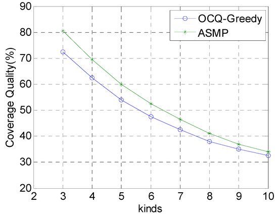 Comparison of the coverage quality for our method (ASMP) with respect to the OCQ-Greedy algorithm when the number of the types of nodes is set to various values, and the coverage quality, which changes with the types of nodes, is set to various values. This figure shows that the coverage quality optimized by our algorithm is much better than that of OCQ-Greedy, especially when the number of the types of nodes is relatively small.