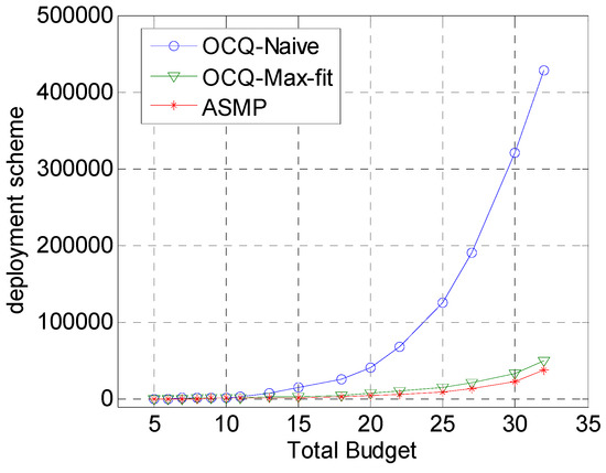 Figure 5 depicts the comparison of the number of deployment schemes derived by OCQ-Naïve, OCQ-Max-fit and ASMP. With the increase of the total budget, each of the algorithms needs to derive more deployment schemes.