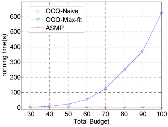 Comparison of the running time for our technique (ASMP) with respect to OCQ-Naïve and OCQ-Max-fit, respectively, when the total budget is set to various values and the running time, which changes with the total budget, is set to various values. This figure shows that the increase of the running time for our coverage strategy is much smaller than that of OCQ-Naïve and a little smaller than that of OCQ-Max-fit, especially when the total budget is relatively sufficient.