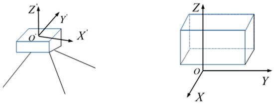 - Calculate the rotational moves and transform the coordinates.The station is always level during scanning. Therefore, the structural coordinate system is established by rotating in the plane. The normal vector of the stable wall is regarded as the positive axis. The rotation angle is the angle between the normal vector and the direction . Therefore, the 3D coordinate transformation is defined by:Here, represents the rotation angle between and ; denotes the translation vector, and in this paper, .