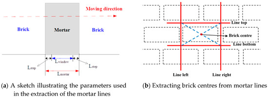- Histogram of Y and Z Axes Using Mortar PointsThe brick point clouds are obtained by the above steps but with no accurate boundaries between different bricks. The wall is coursed masonry which means the masonry and the mortar are almost level to the wall surface. In addition, the 3D coordinates of the points have been transformed to the structural coordinate system as introduced in Section 2.2.1, which indicates that the X axis is perpendicular to the plane of the masonry wall. Therefore, a histogram along the Y and Z axis is used to estimate boundary lines between different bricks. The possible horizontal and vertical boundary lines of the bricks are determined by the peaks of the histogram along the Y and Z axis using the mortar points extracted in step 1. The procedure of determining the lines is as follows:As shown in Figure 6a, a window width and a step width is defined along the Y or the Z axis which satisfies the equation on the width of the mortar between two bricks as follows: